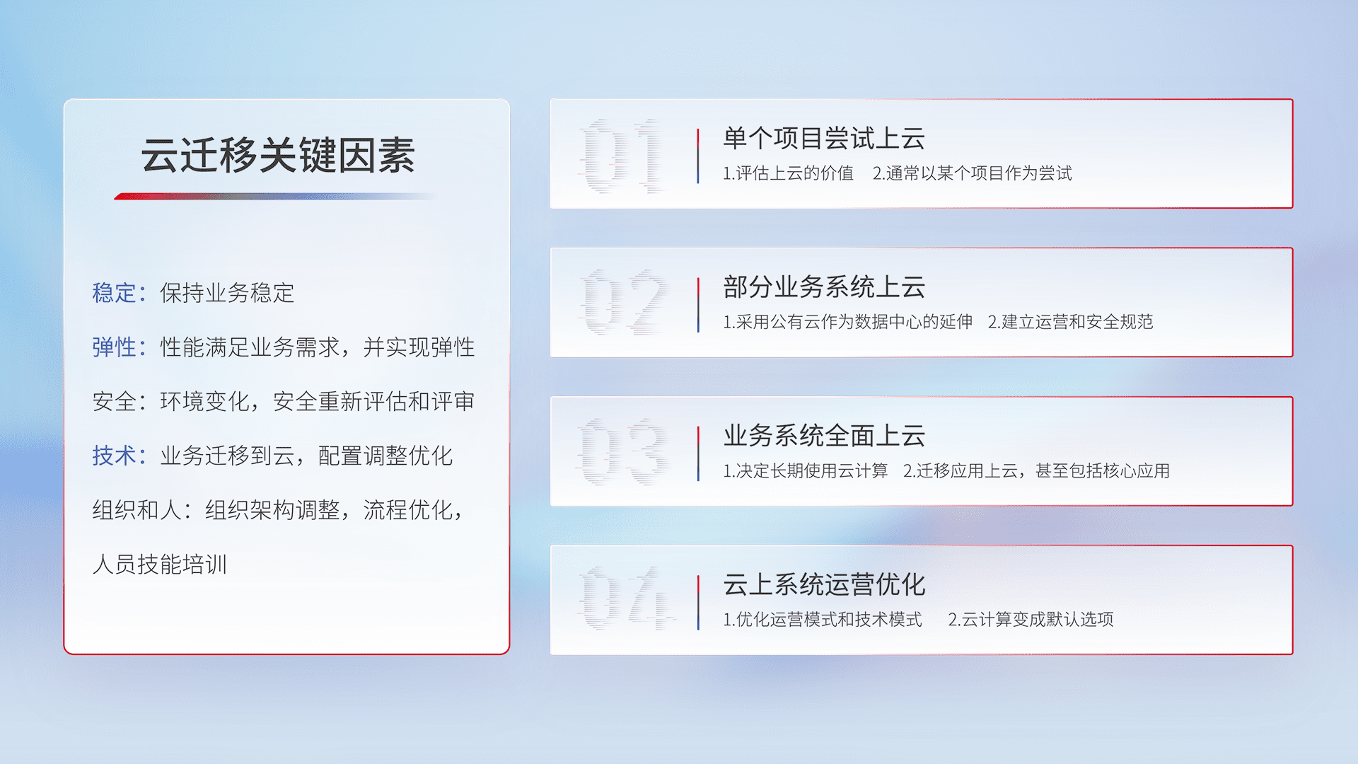 结合实际业务,,从规划设计、、云平台选型、、、、云原生改造、、、、数据迁移、、、集成交付,,迁移全过程为客户识别最佳上云路径,,,,做好风险识别管理,,,,设计网络架构、、、身份权限、、、、安全审计合规、、、、操作审计、、日志审计、、监控告警策略、、多站点容灾设计等,,,对云上基础设施进行整体规划,,提升IT治理水平,,,,以满足弹性、、、、高可用、、、、高性能的需求。。。。