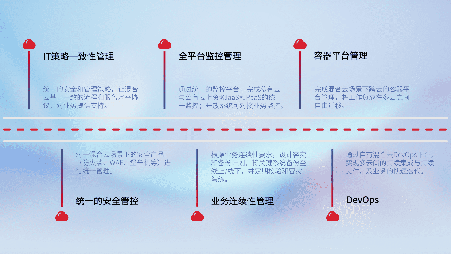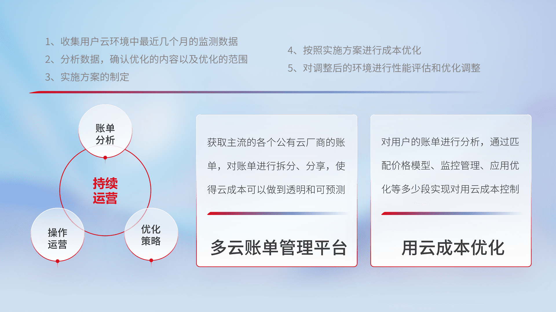 通过多云纳管,,以统一的资源数据模型把客户的云资源进行抽象和封装,,进而实现对多云资源的统一操作,,保障云资源管理的可靠性、、稳定性与可用性。。量身定制化运维内容,,配置、、、开发运维、、补丁管理、、备份、、、监控、、、认证和访问管理、、、审计和日常巡检等,,,保障在用云过程中的可靠度,,,稳定度以及高可用率。。。